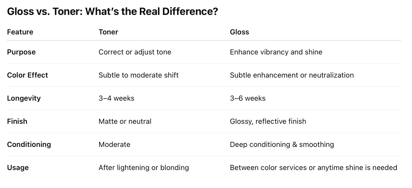Glosses and toners are the unsung heroes of color maintenance. They are small but mighty treatments that make a huge impact. Whether you're looking to revive shine, refresh tone, or correct brassiness, knowing the difference can help you make the best choice for your hair goals.